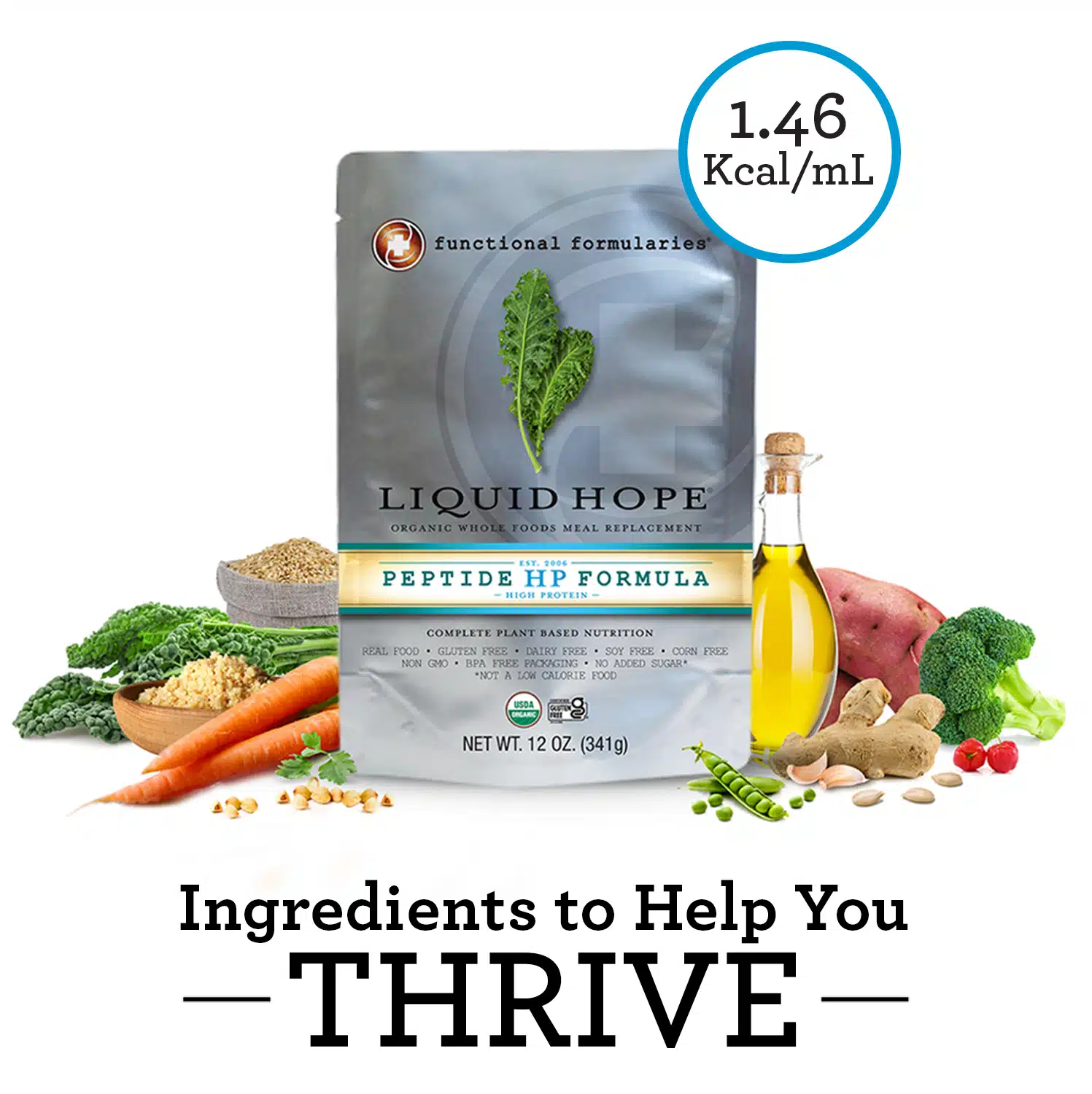c Expand All C Collapse All b Are your formulas vegan? Our formulas utilize Vitamin D3 in the form of cholecalciferol. D3 naturally synthesizes in your skin during exposure to sunlight and it’s also a commercially prepared supplement made from the lanolin retrieved from washing sheeps’ wool; therefore, it may not be considered vegan for some individuals based on their practices. Other than the D3, our formulas are vegan. b Can the product be exposed to high heat and freezing temperatures? Under guidelines of our research laboratories, if Liquid Hope Peptide and Nourish Peptide are stored and handled properly at ambient temperatures of 60º to 70º degrees Fahrenheit, the maximum shelf-life is two years. Is it OK for Liquid Hope Peptide and Nourish Peptide formulas to sit outside in the heat for short periods of time? Yes. Exposure to higher heats (75–100º+) for short periods of time will not negatively affect the nutritional values. The only time the nutritional values will begin to be affected is if the products are stored at high heat for extended periods of time (6–12+ months). If exposed to high heat for an extended period, the nutrient value may be decreased over time. My Liquid Hope / Nourish Peptide was delivered and sat outside in freezing temperatures and is frozen. Is it OK to use? Yes. Freezing can be a very good way to preserve the nutritional value, texture, and flavor of many foods. As long as the food was grown in a high-quality way (for example, organically grown) the overall nutrient retention in a frozen food will remain high. In other words, the vitamins and minerals will keep well when food is frozen. If you do find that your Liquid Hope Peptide or Nourish Peptide has been frozen, just store at ambient room temperature and it will thaw naturally. If you need a pouch right away, please thaw the unopened pouch gently. If you find that your product has been frozen, the product may separate a bit. The product is still perfectly good to use, just shake thoroughly or reblend in a blender to re-emulsify. b What is my shipment/package is damaged? If you receive ANY units of Liquid Hope Peptide or Nourish Peptide that appear to be bloated, damaged, or leaking to any degree, please contact us immediately at 937-433-4673 / Toll FREE: 1.844.631.8365 and/or send an email to office@functionalformularies.com. Do not open, consume, or wash any product that appears to be damaged. Though rare, damage may happen during shipping. Under those circumstances, and with sufficient proof of damage, your product will be replaced by either your Durable Medical Equipment Company or Functional Formularies. b Is this safe? Our Peptide formulas meet all food safety requirements and meet all GRAS, HACCP, and CGMP standards. Liquid Hope Peptide and Nourish Peptide are produced in a FDA/USDA registered facility with a USDA inspector on site. Our formulas undergo thorough testing before they are released from the manufacturer. Both Liquid Hope Peptide and Nourish peptide formulas are shelf-stable, require no refrigeration, and have a two-year shelf life. b What is the hang time? All of our peptide formulas are approved for a 12 hour hang time. b When can I reach an operator? Someone will be available to take your calls Monday–Friday 9–5pm, EST (excluding major U.S. holidays). Your call is very important to us, so if you receive a recording please leave us a message with your name and number and we will return your call within 24 hours. We can also be reached by email. 937.433.4673 TOLL FREE: 1.844.631.8365 b What is our refund policy? Due to the nature of our products, we cannot return any item to stock. After our product leaves our facility we cannot control how it is stored or cared for. We would never ship previously sold products to customers and we feel that you would not want us to do so. We recommend donating your unopened product to someone else who could benefit from it. We can direct you to our partner organizations that distribute our products to their communities. Our products also can be used orally and make a great protein shake or can be included in many dishes. b Who needs more protein than the amounts typically provided in standard formulas? Please consult with your medical team on your own individual protein needs. Some patients have increased protein needs for a variety of individual reasons. Patients who, but not limited to, have experienced significant muscle and/or bone loss due to malabsorption or catabolic processes associated with surgery or burns. Individuals with wounds, sarcopenia, women who are breastfeeding, as well as critically ill patients may benefit from increased protein intake as well. b What are the potential signs of inadequate protein consumption or health effects of under consuming protein? Please consult with your medical team on your individual protein needs. Some signs of protein deficiency include an overall loss of lean body mass (this is a reduction in a patient’s fat free mass vs a loss of weight that may involve significant fat loss), hair loss, slower wound healing, and a reduction in strength and/or physical capacity for exercise. b Why include organic parsley? Organic parsley contains naturally occurring silica which helps support strong bones and muscle mass. b Why are there green flakes in the formula? There may be small visible parsley flakes in the formula as whole parsley leaves often survive the blending process. These flakes should not affect pump compatibility and are a reminder of the whole ingredients that make our formulas unique. b Does Liquid Hope Peptide High Protein work with infusion pumps? Yes, Liquid Hope Peptide High Protein formula works with infusion pumps. b Other than parsley, are there any other ingredient differences between Liquid Hope Peptide and Liquid Hope Peptide High Protein? Most of the ingredients between the two products are the same including the same core vegetables, the biggest change is the quantity 