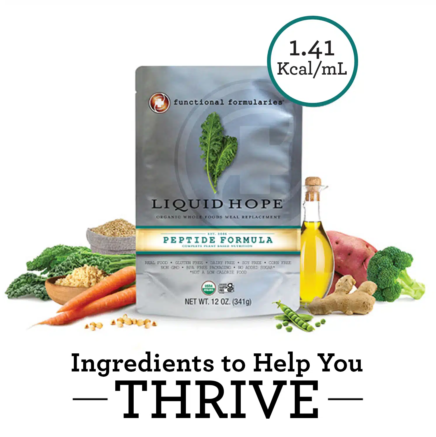c Expand All C Collapse All b Are your formulas vegan? Our formulas utilize Vitamin D3 in the form of cholecalciferol. D3 naturally synthesizes in your skin during exposure to sunlight and it’s also a commercially prepared supplement made from the lanolin retrieved from washing sheeps’ wool; therefore, it may not be considered vegan for some individuals based on their practices. Other than the D3, our formulas are vegan. b Do Liquid Hope Peptide and Nourish Peptide work with infusion pumps? Yes, Liquid Hope Peptide and Nourish Peptide formulas work with infusion pumps. b Can the product be exposed to high heat and freezing temperatures? Under guidelines of our research laboratories, if Liquid Hope Peptide and Nourish Peptide are stored and handled properly at ambient temperatures of 60º to 70º degrees Fahrenheit, the maximum shelf-life is two years. Is it OK for Liquid Hope Peptide and Nourish Peptide formulas to sit outside in the heat for short periods of time? Yes. Exposure to higher heats (75–100º+) for short periods of time will not negatively affect the nutritional values. The only time the nutritional values will begin to be affected is if the products are stored at high heat for extended periods of time (6–12+ months). If exposed to high heat for an extended period, the nutrient value may be decreased over time. My Liquid Hope / Nourish Peptide was delivered and sat outside in freezing temperatures and is frozen. Is it OK to use? Yes. Freezing can be a very good way to preserve the nutritional value, texture, and flavor of many foods. As long as the food was grown in a high-quality way (for example, organically grown) the overall nutrient retention in a frozen food will remain high. In other words, the vitamins and minerals will keep well when food is frozen. If you do find that your Liquid Hope Peptide or Nourish Peptide has been frozen, just store at ambient room temperature and it will thaw naturally. If you need a pouch right away, please thaw the unopened pouch gently. If you find that your product has been frozen, the product may separate a bit. The product is still perfectly good to use, just shake thoroughly or reblend in a blender to re-emulsify. b What is my shipment/package is damaged? If you receive ANY units of Liquid Hope Peptide or Nourish Peptide that appear to be bloated, damaged, or leaking to any degree, please contact us immediately at 937-433-4673 / Toll FREE: 1.844.631.8365 and/or send an email to office@functionalformularies.com. Do not open, consume, or wash any product that appears to be damaged. Though rare, damage may happen during shipping. Under those circumstances, and with sufficient proof of damage, your product will be replaced by either your Durable Medical Equipment Company or Functional Formularies. b What is the product number? Liquid Hope Peptide 24 Pack – LHPSW124 12 Pack – LHP112 6 Pack – LHP106 Nourish Peptide 24 Pack – NOUPWS124 12 Pack – NOUP112 6 Pack – NOUP106 b How many ounces are in each pouch of Liquid Hope Peptide and Nourish Peptide? By law, we are required to list the “ounces” and “grams,” which are measures of weight, not measures of volume, on the food label. Because the formula is made from real food, its density can vary and, as such, so can the volume of the formula in each pouch. Rest assured, each pouch contains 341 grams as measured on a gram scale. All nutritional information stated on our website and packaging is correct. It is calculated and tested per pouch, and the most accurate measure is 341 grams which is what our manufacturers use as a gauge of measurement on calibrated scales. Any pouch below 341 grams is rejected. The conversation of weight is a complex one due to the fact that our product, per food labeling laws, has to show 12 ounces on the label. However, our products are not fluid ounces as most people expect, due to the viscosity. A glass measuring cup or syringe with ounce measurements is designed to measure only fluid ounces. Our product, due to it not being “fluid” or thin as water, will only show 10 ounces. We have done our best to offer accurate mL measures as a courtesy knowing that RDs are used to working with this measuring system. Why are there variables in mL from pouch to pouch? When it comes to measuring solids, weight (grams) is generally considered as more accurate than volume (mL). This is because the weight of a substance on Earth will remain constant even if its surrounding condition changes (e.g. if it gets hotter or colder). On the other hand, the amount of space (volume) occupied by a substance—especially if it is a liquid—can be affected by things like changes in temperature without the substance changing its form. b Does Insurance cover Liquid Hope Peptide and Nourish Peptide? Yes! More than 96% of insurances cover our products (Medicare, Medicaid, and many private insurances). At Functional Formularies we have patient advocates available to help you gain insurance coverage for our products. Please email us at: insurance@functionalformularies.com or call us at 937.433.HOPE (4673) and we will set up an appointment for you with a patient advocate. Click here for Insurance information. We are the first organic enteral formula to be approved by Medicare. Nourish Peptide : HCPCS Code: B4161 Insurance Data Bank & Billing Code: 57858-0004-27* Liquid Hope Peptide: HCPCS Code: B4153 Insurance Data Bank & Billing Code: 57858-0004-28* *Medicare, Medicaid and health insurers may ask you to provide a National Drug Code/NDC number for insurance claims, billing or reimbursement purposes. Because our products are whole foods and do not constitute “drugs”, we have an Insurance Data Bank and Billing Code that you should use when asked for an NDC number for our products. b Are there any variations in consistency with real food product? Our Peptide formulas undergo regular nutritional assessment and lab testing. However, as with all real food products, the nutri